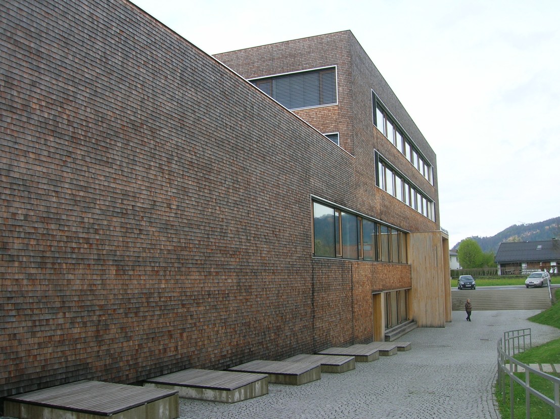 Mi ha colpito soprattutto il rivestimento di tutta la facciata con la tecnica delle scandole, che pare essere abbastanza tradizionale nel Vorarlberg ma che certo è suggestivo trovare in un edificio moderno e di queste dimensioni. Un rivestimento naturale, impermeabile, pressoché eterno e con delle variazioni cromatiche piacevoli.