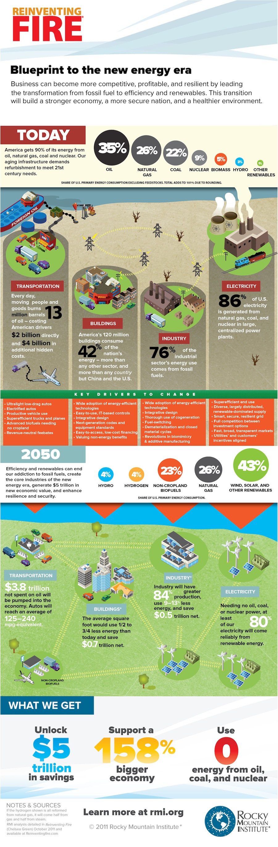 (by Amory Lovins, Marvin Odum, Joh W. Rowe) Built on Rocky Mountain Institute’s 30 years of research and work in the field, Reinventing Fire maps pathways for running a 158%-bigger U.S. economy in 2050 but needing no oil, no coal, and no nuclear energy.Built on Rocky Mountain Institute’s 30 years of research and work in the field, Reinventing Fire maps pathways for running a 158%-bigger U.S. economy in 2050 but needing no oil, no coal, and no nuclear energy. [Rocky Mountain Institute]
