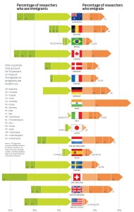L’analisi fatta trova un’interessante riscontro nel grafico seguente, che riporta i risultati del documento ‘Foreign born scientists: mobility patterns for sixteen countries‘ di Chiara Franzoni, Giuseppe Scellato e Paula Stephan (National Bureau of Economic Research) sulle percentuali di ricercatori in ingresso/uscita nei singoli paesi. Se ne ricavano ulteriori riflessioni sulla competitività delle nazioni.