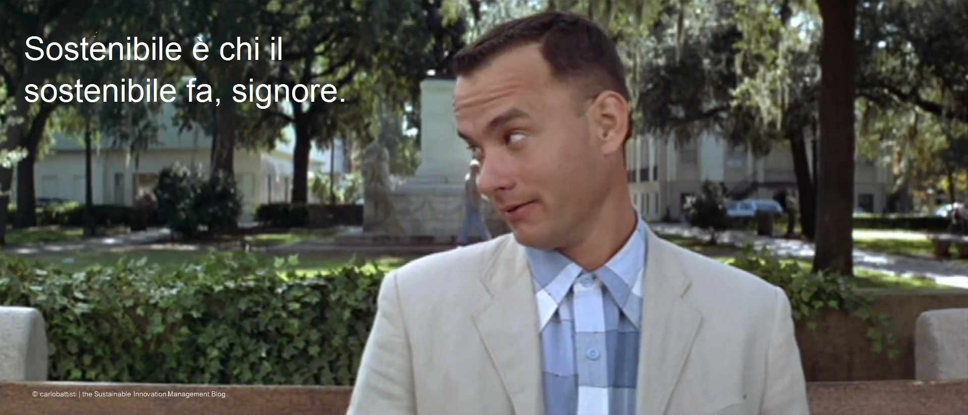 Sostenibile. Sostenibile è chi il sostenibile fa, signore. – Forrest Gump (rev.) Share this: Click to email a link to a friend (Opens in new window) Email Click to share on Facebook (Opens in new window) Facebook Click to share on X (Opens in new window) X Click to share on LinkedIn (Opens in new window) LinkedIn More Click to share on Tumblr (Opens in new window) Tumblr Click to share on Pinterest (Opens in new window) Pinterest Click to print (Opens in new window) Print Like Loading... Related ImagesQuoteSustainability