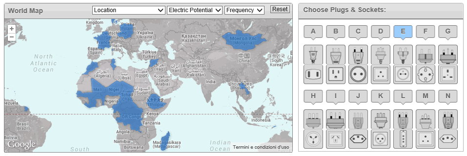 Per ogni presa selezionata nella tabella, una mappa mondiale Vi indica in quali paesi questa presa è in uso.