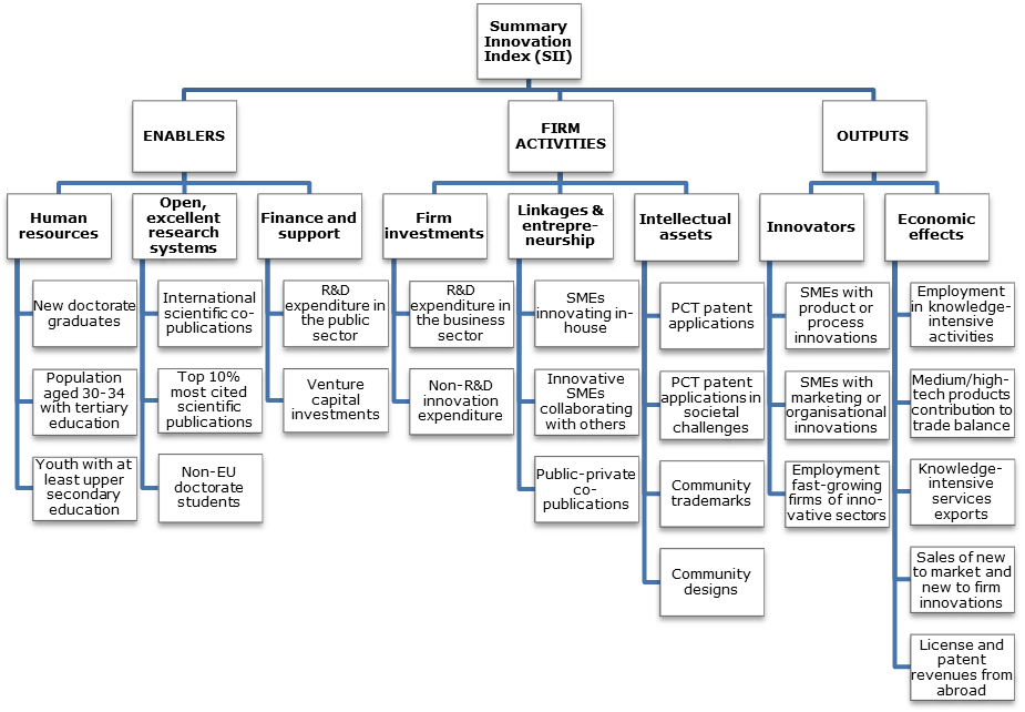The Innovation Union Scoreboard, following the methodology of the previous editions, captures a total of 25 different indicators, distinguishing between eight innovation dimensions and three main categories of indicators: