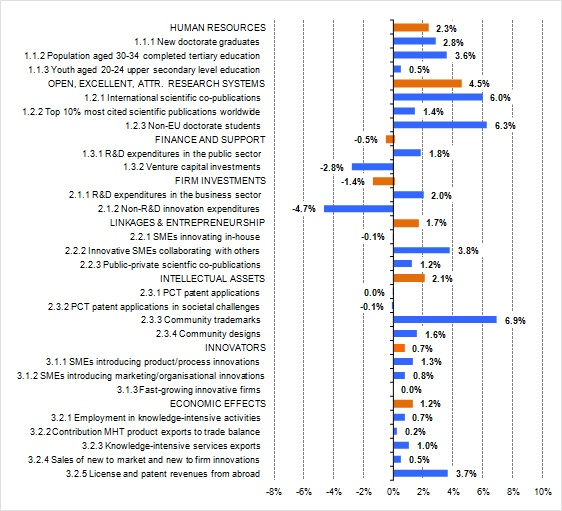 When looking at individual dimensions, Open, excellent and attractive research systems contributed most to the overall innovation performance over the last eight years, followed by growth in Human resources. Looking at individual indicators, Community trademarks contributed most to the increase of the innovation performance, followed by Non-EU doctorate graduates and International scientific co-publications. Relatively good performance improvement is also observed in Innovation collaboration of SMEs and commercialisation of knowledge as measured by License and patent revenues from abroad.