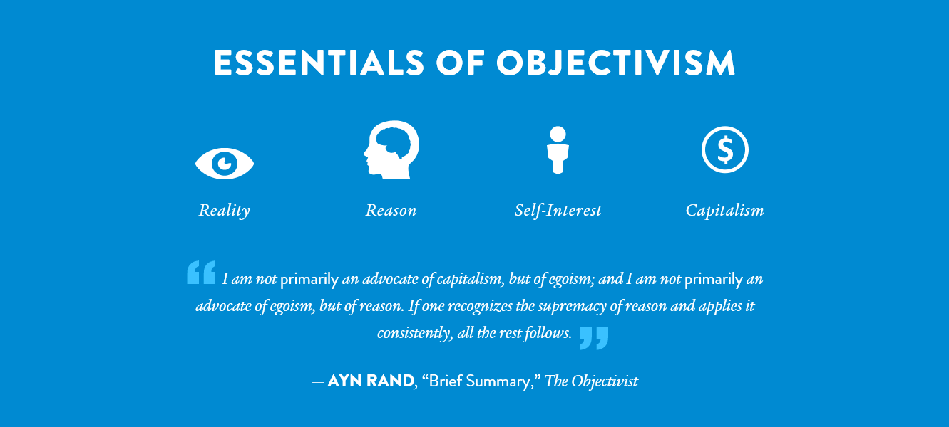 Sostenitrice dell’individualismo e dell’egoismo razionale, da lei inteso come la più naturale e importante delle virtù, in quanto consiste nel cercare il proprio bene senza arrecare danno agli altri. Tale visione etica è madre del capitalismo senza limiti, unica società possibile al che l’uomo raggiunga la propria felicità individuale grazie al proprio lavoro e quindi alla sua abilità. Ostile ad ogni forma di collettivismo socialista e fascista, la sua filosofia si basava sul concetto che «la più piccola minoranza al mondo è l’individuo. Chiunque neghi i diritti dell’individuo non può sostenere di essere un difensore delle minoranze». [Wikipedia]