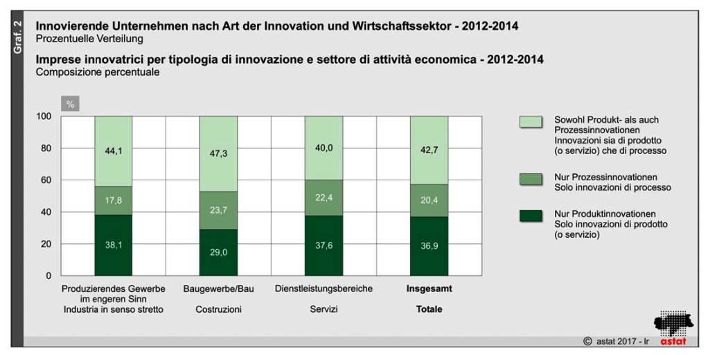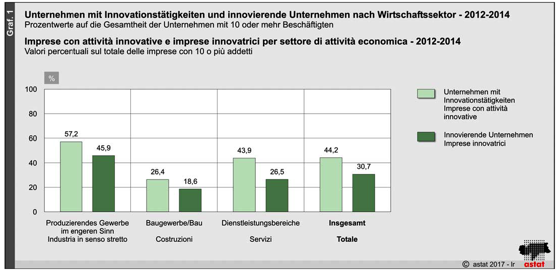 L’innovazione è considerata una chiave fondamentale per il successo aziendale. Tra il 2012 e il 2014 sono state 908 le imprese altoatesine con 10 o più addetti che hanno svolto attività di innovazione (anche chiamate imprese innovative). Tale cifra è pari al 44,2% dell’universo considerato (2.053 imprese). Vengono considerate imprese con attività innovative tutte le imprese che hanno dichiarato di aver introdotto innovazioni di prodotto, servizio o processo oppure svolto attività finalizzate all’introduzione di tali innovazioni. Vengono inoltre incluse in tale definizione anche le imprese con attività che implicano innovazioni di tipo organizzativo e di marketing. Delle imprese considerate, 630 (30,7%) hanno introdotto almeno un nuovo prodotto, un nuovo servizio o un nuovo processo produttivo o intrapreso attività innovative e quindi si possono definire imprese innovatrici.