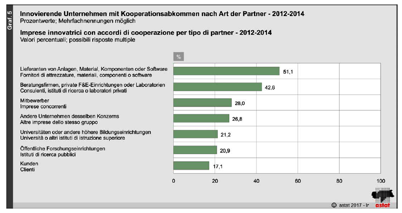 Assolutamente incoraggiante infine, a mio avviso, il dato sull’efficacia dell’innovazione. Nel 2014 in Alto Adige il fatturato delle imprese innovatrici derivante dalla vendita di prodotti e servizi nuovi (sia per l’impresa sia per il mercato) ammonta al 18,5% del loro fatturato totale. Sia questo risultato che quello precedente sulla cooperazione sono 4-5 punti % superiori alle medie nazionali. L’incidenza nel fatturato dei prodotti-servizi nuovi per il settore delle Costruzioni è del 12,1%. Considerando anche la quota di fatturato che si investe in innovazione – per il settore delle costruzioni – a fronte di un investimento dello 0,9% di fatturato in innovazione, si ha un ritorno economico, derivante dai nuovi prodotti, pari al 17,6% del volume d’affari (!).