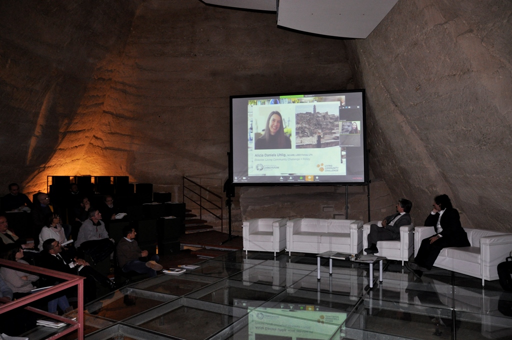 Alicia Daniels Uhlig, in collegamento da Seattle, ha illustrato il protocollo Living Community Challenge, con alcuni paralleli interessanti con l’esperienza di Matera. Nell’introduzione all’evento Michele Massaro, del Collaborative Italy, ha sottolineato come le buone pratiche di sviluppo urbano di Matera, siano un esempio ancora molto attuale di sostenibilità dell’ambiente costruito. Giuseppe Larato, pure del Collaborative, ha poi sintetizzato i più diffusi protocolli sulla sostenibilità degli edifici, aprendo la strada a una riflessione su LBC. Dal Politecnico di Bari, Francesco Fiorito ha evidenziato l’importanza di ridurre l’effetto isola di calore all’interno dei centri urbani; mentre Fabio Fatiguso ha analizzato i Sassi come caso studio di resilienza urbana per contrastare gli effetti del cambiamento climatico. Carlo Battisti, facilitatore del Collaborative italiano, ha infine fornito una panoramica sul protocollo LBC e sulla missione dell’International Living Future Institute.