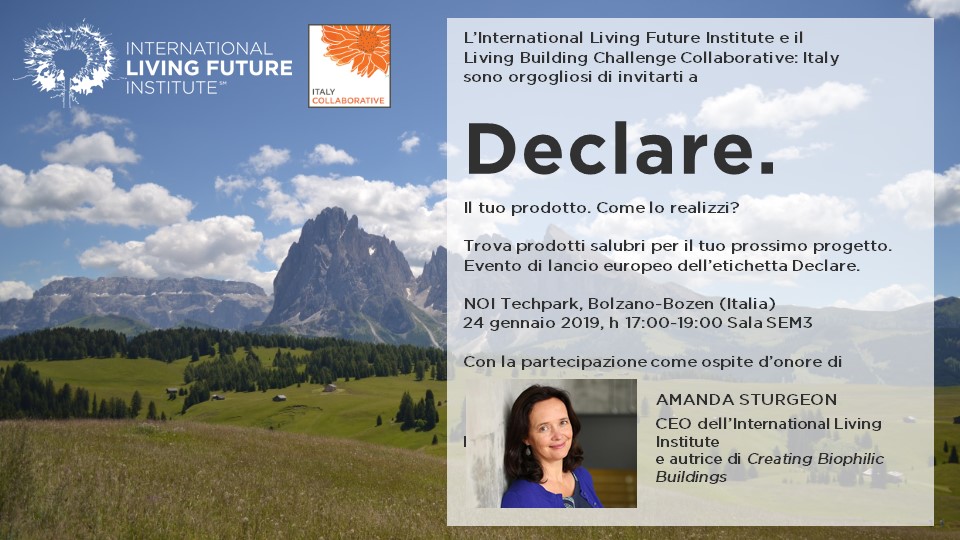 Sempre giovedì 24.01, nel pomeriggio ore 17-19 non mancate la prima europea dell’etichetta di trasparenza per i prodotti Declare, dell’International Living Future Institute. Amanda Sturgeon presenterà il programma Declare, all’interno di un workshop con testimonianze di alcune aziende del settore che racconteranno come realizzano i loro prodotti. L’evento rientra nelle attività Living Future Europe, grazie alla sponsorizzazione dei partner globali Knauf Insulation, Elementa, Kingspan, Tarkett e HumanScale. L’evento conta inoltre sul supporto locale delle aziende Assmann (transformative sponsor) e Ton-Gruppe, Eurofinestra e Mafi (visionary sponsor). Per partecipare, richiedere il biglietto di ingresso gratuito qui. Programma: ita / deu / eng