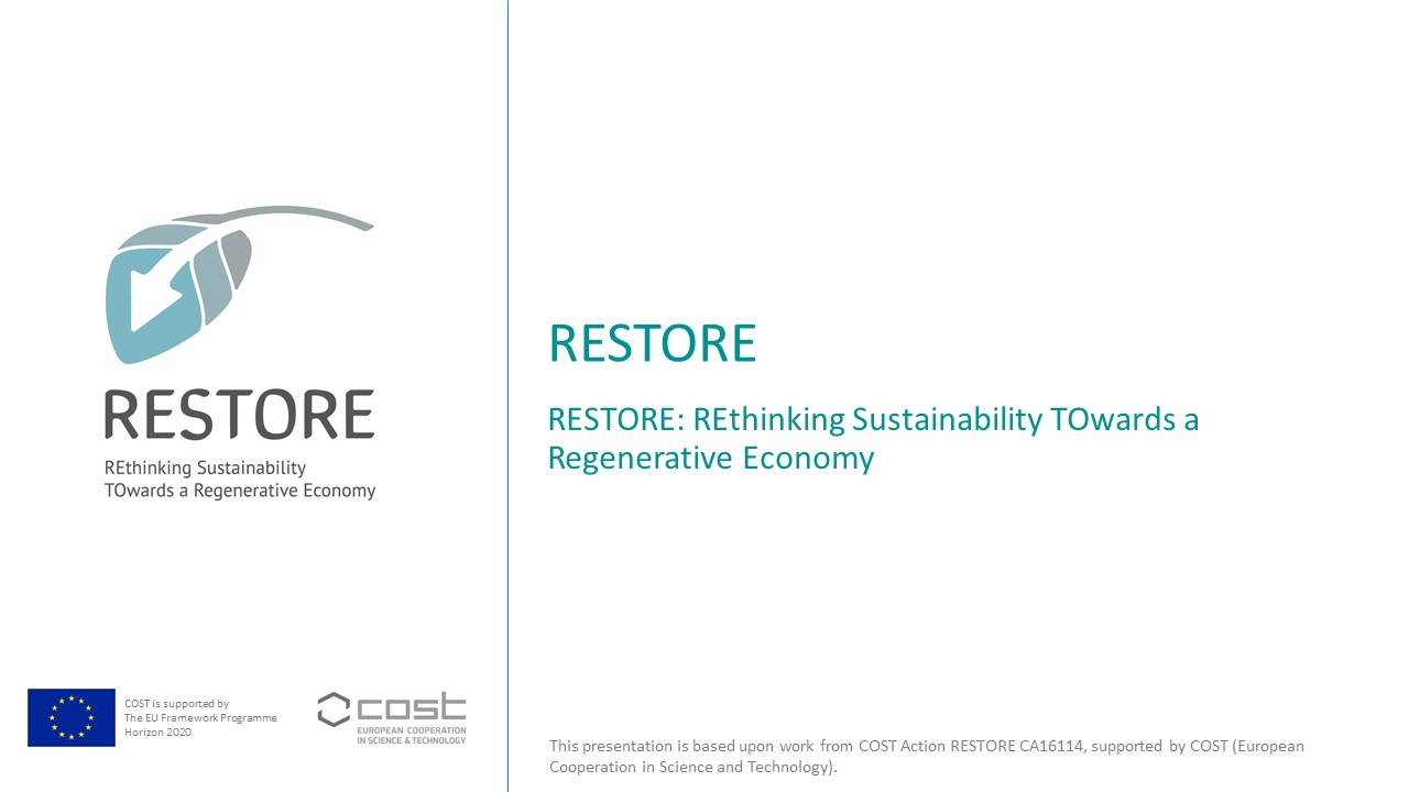 After six years from the beginning of this journey (the first RESTORE idea dates back to April 2015), and four years and a half from COST RESTORE proposal approval, the #CostRestore Action has come to its end, last April 30th, 2021. I would express my sincere thanks and gratitude to all the RESTORE members, stakeholders and all those who supported our Action, sharing the principles that guided our vision and commitment. The successful experience we shared is simply amazing. Collectively, we did our best to ‘rethink sustainability towards a regenerative economy’ with an impressive number of high-quality outcomes proof of our incredible collaboration, also despite the pandemics and the impossibility to meet for the last 14 months.