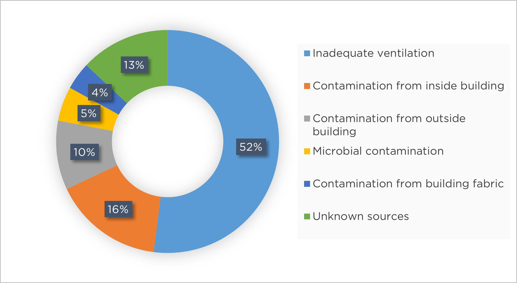 Humans breathe more than 15,000 litres (15 m3) of air every single day, consuming approximately four times more air than food and liquid together[1]. Health effects associated with exposure to indoor air pollutants can be short- and long-term and can range in severity and in the most recent global burden of disease study, household air pollution was rated as the third most important cause of ill health for the world’s population[2]. Sources of indoor air quality concern are illustrated on the following image, where inadequate ventilation alone represents more than 50% of the causes[3].