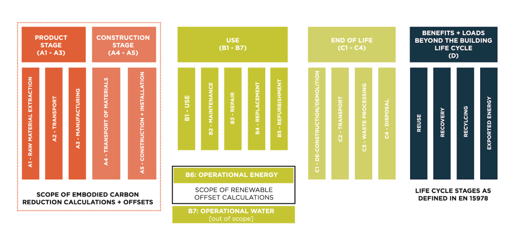 Questo programma prevede che l’edificio abbia comunque delle prestazioni elevate dal punto di vista energetico e che il 100% dell’energia consumata sia coperto da fonti rinnovabili sul posto e/o off-site, mentre il 100% dell’impatto dei materiali venga ridotto al di sotto delle soglie medie di emissioni dei rispettivi settori produttivi (almeno il 10% per quanto riguarda la struttura dell’edificio). In pratica, le fasi A1÷A5 e B6 del ciclo di vita di cui all’immagine seguente. Le emissioni totali di carbonio contenute nel progetto alla fine non devono superare i 500 kg-CO₂e/m², e devono essere compensate una tantum secondo un programma certificato Green-e Climate o equivalente. Il tutto – come di consueto per i programmi ILFI, questa la differenza gigantesca con gli altri standard di sostenibilità internazionali dell’ambiente costruito – monitorato su almeno 12 mesi dall’inizio dell’occupazione dell’edificio. La certificazione Zero Carbon è basata sull’approccio Science Based Targets.