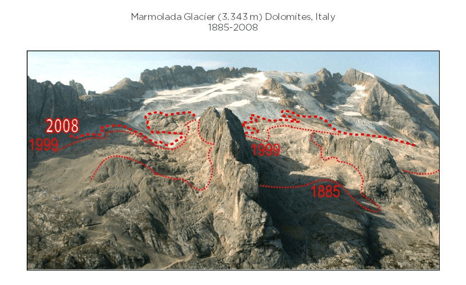 Ho usato queste immagini della Marmolada (quella sopra è per gentile concessione di Franco Secchieri, 2019) all’inizio delle mie presentazioni fino a tre anni fa. Poi ho smesso, mi sembrava che la gente si annoiasse o forse non ci faceva caso più di tanto. Così sostituivo l’inizio con qualcosa del tipo “non c’è bisogno che vi mostri le solite immagini catastrofiche, tanto sapete già, passiamo oltre, a parlare di soluzioni“.